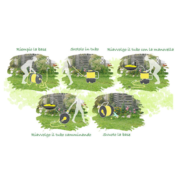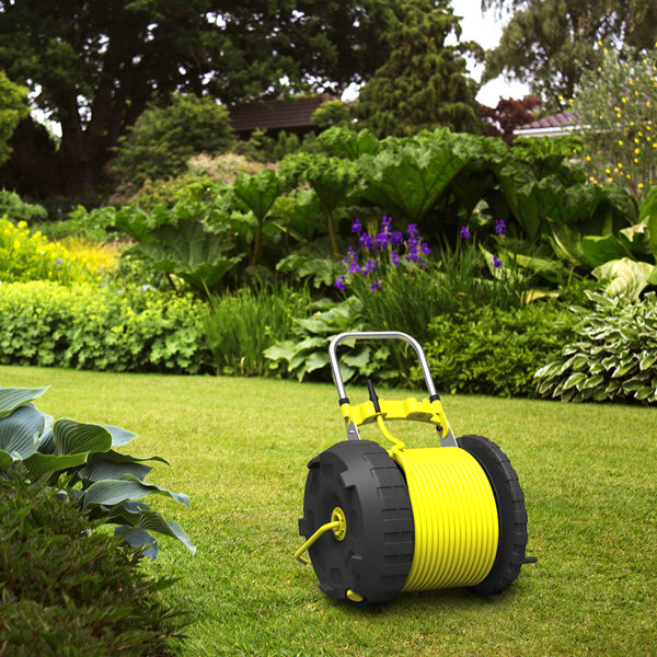 L'invenzione consiste in un nuovo sistema per realizzare un carrello avvolgitubo in modo da facilitare l'impiego. Il rullo avvolgitore è supportato da due ruote di cui una cava, realizzata in modo da poter essere riempita d'acqua. In questo modo il carrello può essere appoggiato con la ruota come basamento durante l'uso e quindi con l'avvolgitore disposto in modo verticale. Ciò rende molto stabile il supporto ed evita il ribaltamento accidentale facilitando lo svolgimento e il riavvolgimento del tubo. Una volta terminata l'irrigazione si può utilizzare l'acqua contenuta nella ruota per annaffiare. Un dispositivo permette di bloccare la ruota all'avvolgitore per poter riavvolgere il tubo anche trainando il carrello, in alternativa all'uso dell'apposita maniglia.
